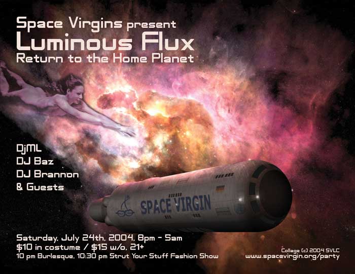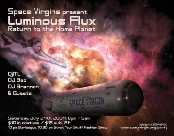 | Space Virgins present | ![]() | Luminous Flux View photos from Luminous Flux Saturday July 24th, 2004 9pm - 4am