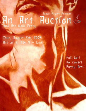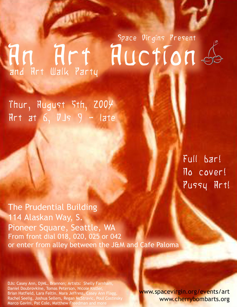 Art Auction Please join us on Thursday, August 5th after Art Walk (9 pm - late) for a party and auction of art works produced by the Space Virgins and our friends. Works will be on display at Red Stripe Studios in the Prudential Building on 114 Alaskan Way S in Seattle. To enter, dial 018, 020, 025 or 042, or enter from the alley in the rear between the J&M and Cafe Paloma on First. There will be a full bar and DJs Casey Ann, DjML, and Brannon will keep the beats bumpin'. Artists include Shelly Farnham, Daniel Doubrovkine, Tomas Peterson, Nicole Kistler, Brian Hatfield, Lara Feltin. Mara Jeffress, Casey Ann Flagg, Rachel Seelig, Joshua Sellers, Regan McStravic, Poul Costinsky, Pat Cole, Marco Gavini and Pmatt Freedman. Questions? E-mail info@spacevirgin.org |