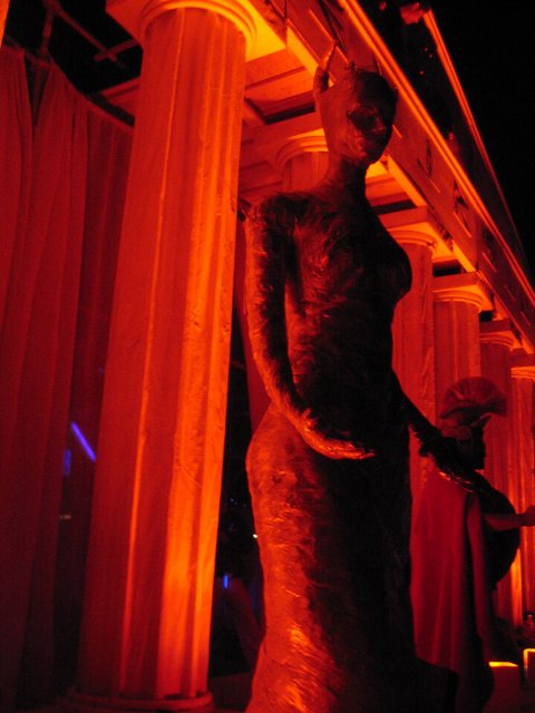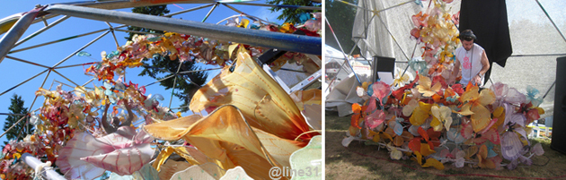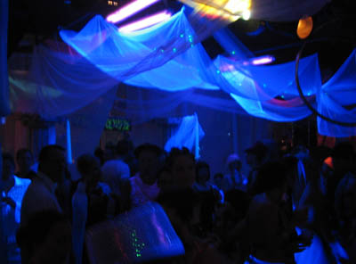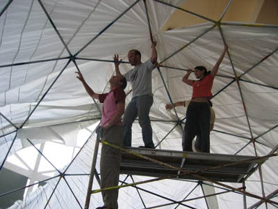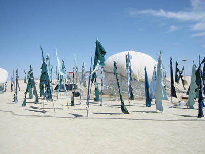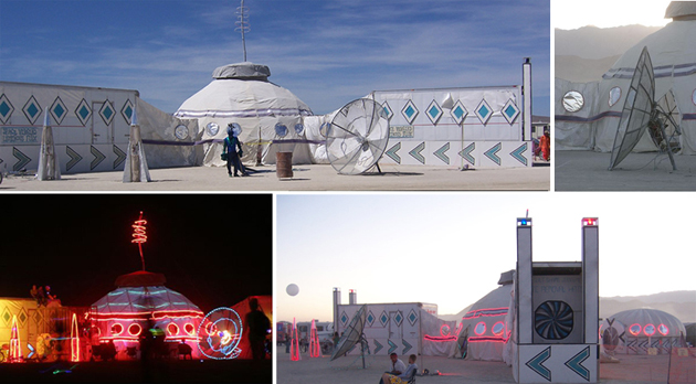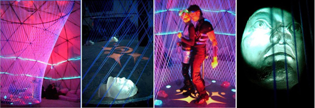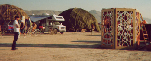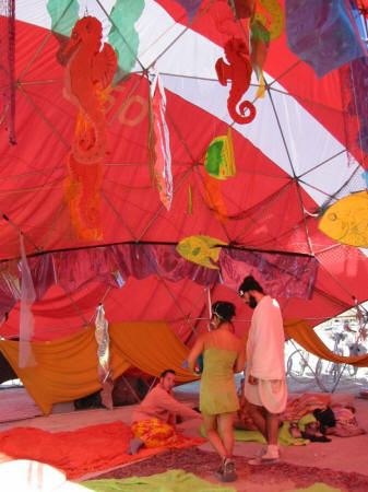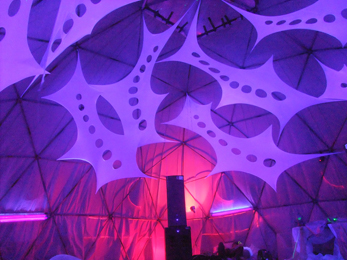 We created a 32 foot geodesic dome, with a hand sewn cover made out of sail cloth, and decorated the dome to look like a Persian pleasure palace, with draperies, rugs, and pillows.