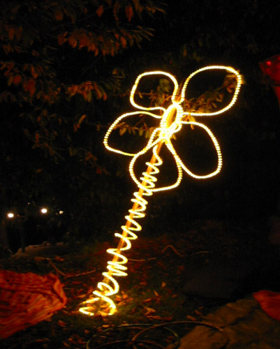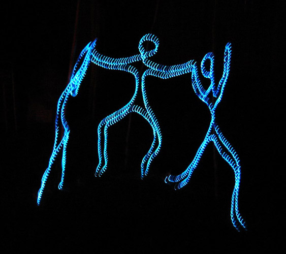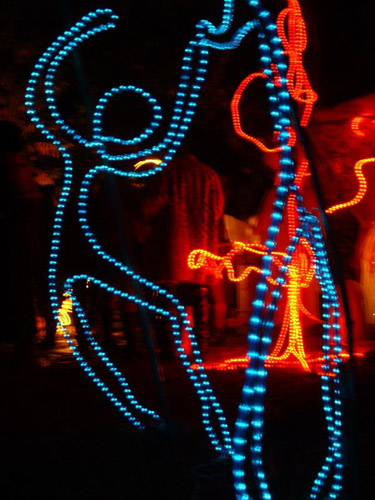 A garden made out of rope lights sculpted into 2 to 8 foot flowers, with several life-sized dancing human figures dancing amongst the flowers