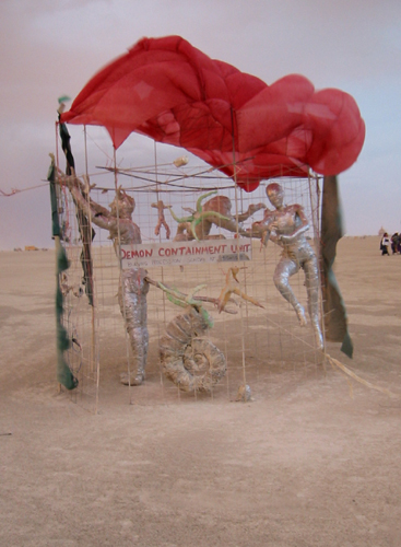 This project explores the psychological impact of making structures to burn them, knowing they represent inner demons. Several human sized demons were made as models, and then we had a "demon making workshop" to help others make demons. All demons were burned.
