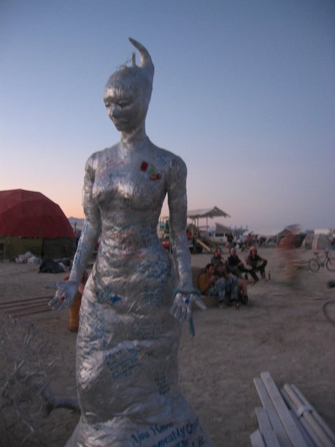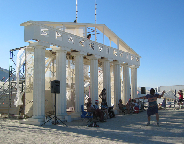 Virgin Goddess was created to play the role of a ritualistic virgin sacrifice. The structure included a fountain component, with water pouring out of her hands to bless her worshippers. People wrote notes on the form before it was burned.