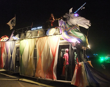 Art car bus, decorated as a Unicorn, with raindow to symbolize loving acceptance of all peoples!